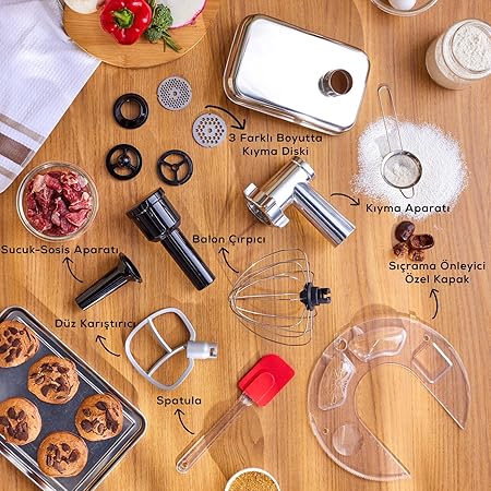 Bunun yanında Kıyma Çekme, Sucuk – Sosis, ve içli Köfte aparatları olmak üzere 3 farklı fonksiyonuyla kullanım çeşitliliği sunar. Yörüngesel hareket etme özelliği; yumurta çırpma, sos hazırlama, ekmek yoğurma ve puding- kek hazırlamak için en ideal karıştırmayı yapar.