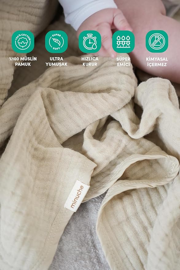 Bebeğinizin hassas cildini için ekstra yumuşak %100 müslin kumaştan üretilmiştir.