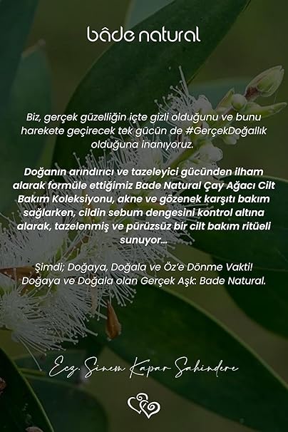 ♥Nasıl Üretiliyor? Bade Natural Akne Önleyici Çay Ağacı Özü Tonik, sertifikalı üreticilerden tedarik edilen hammaddeler ile AR-GE merkezimizdeki kalite kontrol testleri sonrasında fabrikamızda dolum işlemleri tamamlanarak üretiliyor. Bade Natural ürünleri %100 doğal hammaddelerle ve %100 saf uçucu yağlar ile formüle edilir. Ürünlerimizin tamamı dermatolojik olarak test edilmiştir. Paraben, sülfat, SLES, SLS, sentetik koku, sentetik boya içermez. Doğa dostudur ve hayvanlar üzerinde test edilmemiştir.