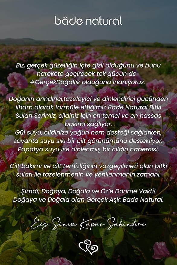 ♥Nasıl Üretiliyor? Su buharı distilasyonu ile gül uçucu yağı çıkarılırken elde edilen %100 Saf Gül Suyu’dur. 1. distilasyon ve gül yağı oranı en yüksek Gül Suyu’dur. Bade Natural Gül Suyu, sertifikalı üreticilerden tedarik edilen hammaddeler ile AR-GE merkezimizdeki kalite kontrol testleri sonrasında fabrikamızda dolum işlemleri tamamlanarak üretiliyor. Bade Natural ürünleri %100 doğal hammaddelerle ve %100 saf uçucu yağlar ile formüle edilir. Ürünlerimizin tamamı dermatolojik olarak test edilmiştir. Paraben, sülfat, SLES, SLS, sentetik koku, sentetik boya içermez. Doğa dostudur ve hayvanlar üzerinde test edilmemiştir.