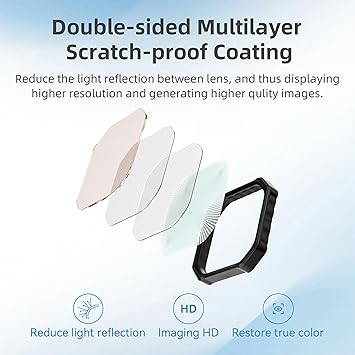 【Çift Taraflı Çok Katmanlı HD Optik Cam】 Bu filtreler, su itici, çizilmeye karşı dayanıklı ve yağ geçirmezlik sağlayan ve filtrenin kendisinden ve zeminden gelen yansımayı azaltan her iki tarafta birden fazla fonksiyonel kaplamaya sahip yüksek kaliteli optik camla üretilmiştir.