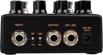 Daha büyük dinamikler: True bypass / Buffer-Bypass devirmeli şalter ve 9 V / 18 V devirmeli şalter sayesinde iç kısımdaki çalışma gerilimi iki katına çıkarılabilir.