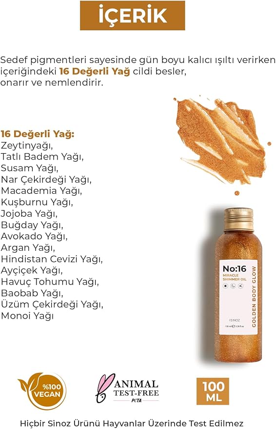 Kullanım: Sinoz No:16 Mucizevi Işıltılı Bakım Yağı’nı kullanmadan önce çalkalayın ve vücudunuzda arzu edilen temiz ve kuru bölgeye uygulayınız. Yüz,vücut ve saç için kullanıma uygundur.