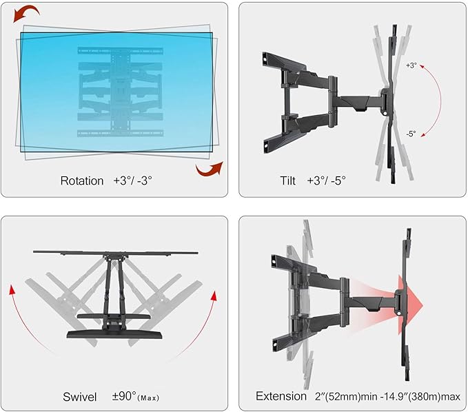 ☑ Ultra İnce Tam hareketli mafsallı duvar montajı, duvardan 14,9 inç (380 mm) kadar uzanır, yerden tasarruf etmek için 2 inç (52 mm) geri çekilir, optimum görüntüleme konumu için Eğim Açısı +3° ila -5° arasındadır. Bir yerine Çift Kol, daha güçlü ve güvenilir hale getirir