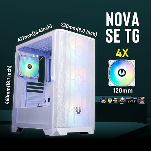 Nova Mesh SE TG PC kasası, oyun bilgisayarı kulesi, 4 takılmış ARGB fanı, ARGB denetleyici, ağ ön, sertleştirilmiş cam, mükemmel kablo yönetimi, beyaz