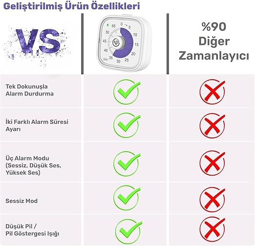 Sessiz çalışması ve görsel olarak zamanı net şekilde göstermesi sayesinde LGS, KPSS gibi sınavlara hazırlanırken daha verimli bir çalışma ortamı sunar. Zamanı bölerek planlı çalışmayı öğretir, dikkat dağınıklığını azaltır