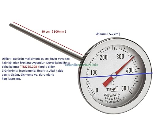 Ø52mm 0/500 C° 30 cm Dalma Boylu Fırın Termometresi, 30 cm Problu 500 Derece Bahçe,Pizza,Pide,Ekmek,Köy,Kara/Taş Fırın Isı Gösterge Saati TFA Dostmann TM832.14.1035.60
