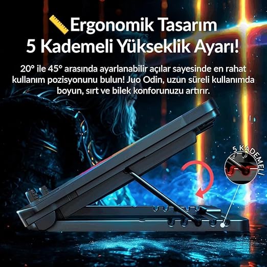 Ergonomik Tasarım ve Ayarlanabilir Yükseklik Uzun süreler bilgisayar başında vakit geçirenler için konfor çok önemlidir. Juo Odin, 5 farklı yükseklik ayarı (20° – 45°) sunarak göz hizanızı ve bilek pozisyonunuzu en rahat hale getirecek şekilde ayarlanabilir. Bu özellik, sırt, omuz ve boyun ağrılarınızı azaltmaya yardımcı olurken, aynı zamanda daha konforlu bir yazım ve oyun deneyimi sunar.