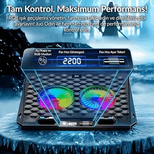 Juo Odin RGB Gaming Laptop Soğutucu dizüstü bilgisayarınızı serin tutarak performansını artırmak ve uzun ömürlü olmasını sağlamak için tam ihtiyacınız olan üründür. Yüksek hava akış gücüne sahip çift 110mm fanlı güçlü soğutma sistemi ile laptopunuzun aşırı ısınmasını engelleyerek en zorlu oyunlarda, yoğun grafik işlemlerinde ve uzun süreli çalışma seanslarında bile performansınızı korumanıza yardımcı olur. 2200 RPM fan hızı, sıcak havayı hızla dağıtarak cihazınızın optimum sıcaklıkta kalmasını sağlar. Üstelik, fan hız kontrolü sayesinde soğutma gücünü ihtiyacınıza göre ayarlayabilirsiniz.