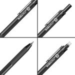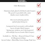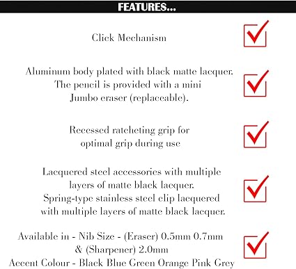 Siyah metal aksesuarlar. Tepede muhafazalı silgi. Tepeden basmalı mekanizma. Metal gövde. Ergonomik tutuş.