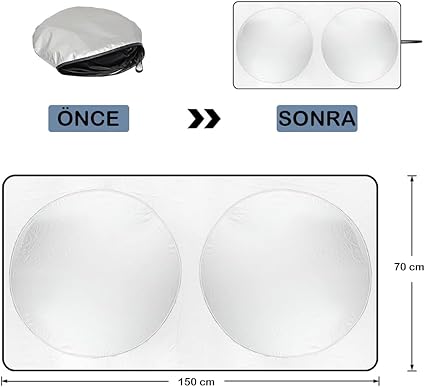 Katlanabilme özelliğiyle aracınızda yer işgal etmeden kolayca taşıyabileceğiniz ürün, 150 cm’lik genişliği ve 70 cm’lik yüksekliğiyle tüm standart otomobil modelleriyle uyumludur. Ön cama yerleştirip her iki taraftaki güneş siperliklerini açarak ön cama sabitlenmektedir.