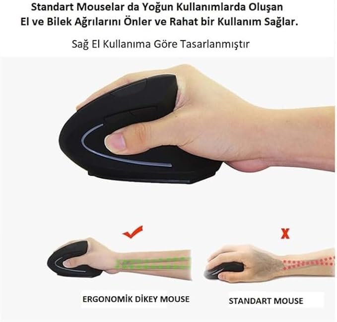 2.4G Wireless Vertical/Dikey Optik Ergonomik Mouse Yeni ve yüksek kalite ergonomik tasarım. Bilimsel ergonomik tasarım, daha yumuşak hareket ve daha az genel gerginlik için sağlıklı nötr “el sıkışma” bilek ve kol pozisyonlarını teşvik eder. Fareyi farklı bir açıda kullanmaya alışmak biraz zaman alır. Bir kez alıştığınızda, onu çok seveceksiniz!