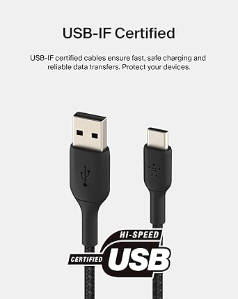 Örgülü USB-C Kablosu (Boost Charge, Note10, S10, Pixel 4, iPad Pro, Nintendo Switch için) 1 Metre, Siyah
