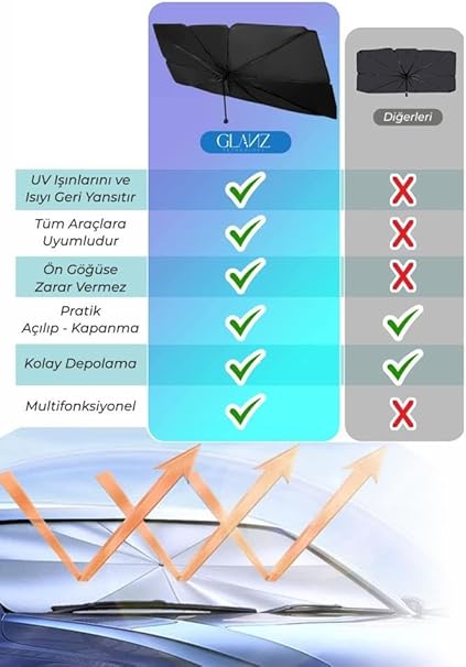 Güneş Koruma: Glanz Oto Katlanabilir Güneşlik Şemsiyesi, araç içerisinde 40C’lik günde güneş ısısını 25C’ye dönüştürerek, otomobilin ön panelini, koltuklarını ve direksiyonunu güneş hasarından korur.