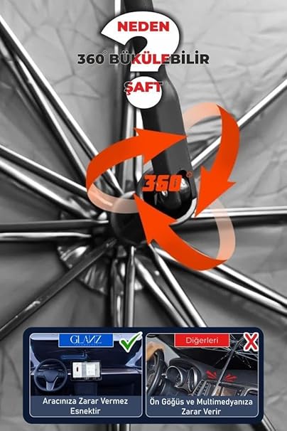 360° Bükülebilir Şaft: Glanz Oto Katlanabilir Güneşlik Şemsiyesi, tüm araçlara uyum sağlar ve aracınızın ön göğsüne ve multimedya kısmına zarar vermez.