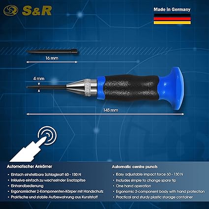 OTOMATİK HASSASİYET: S&R Otomatik Orta Zımba ile hassasiyetin gücünü ortaya çıkarın. Zahmetsiz ve doğru merkez delme için araç setinizi yükseltin. Alman mühendisliği mükemmelliği ile işçiliğinizi yükseltin!
