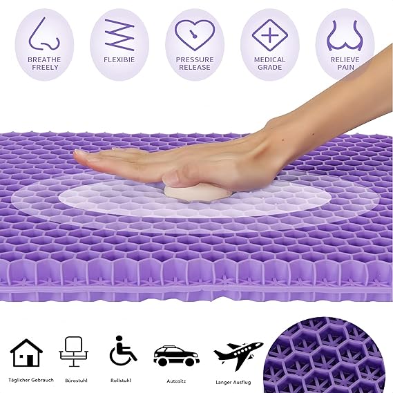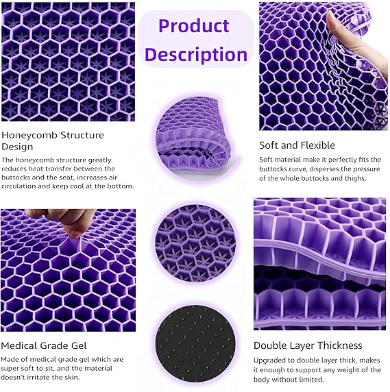 Jel yastık oturma minderi özellikleri: Petek yapısı, halka tasarımı hava sirkülasyonunu artırır ve konfor sağlar, çok elastik polimer malzeme, çift katmanlı tasarım ağırlığınızı dağıtır, daha yumuşaktır, rahat ve rahat bir oturma pozisyonu sağlar ve vücudun daha iyi rahatlamasını sağlar
