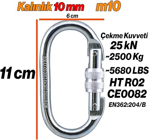 Oval Karabina Kilitli 10 mm Kanca Paslanmaz Çelik Kilit Tırmanma Kamp Ekipman Tırmanış İp Askı Kilid