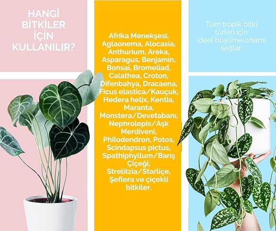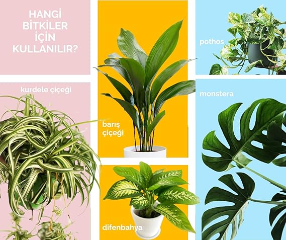 Monstera, Alocasia, Anthurium, Starliçe , Difenbahya, Kauçuk, Calathea, Philodendron, Palmiyeler, Schefflera, Dracaena vb bitkiler için idealdir.