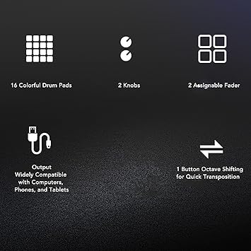 Çok yönlü kontroller: MIDI denetleyici ped 2 atanabilir fader, 2 ayarlanabilir düğme ve gelişmiş müzik oluşturma için güçlü gürültü azaltma içerir. Müzikal fikirlerinizi ifade etmenin daha fazla yolunu sunar.