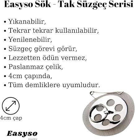 İnce Gözenekler ve Sağlam Materyal. Easyso yaprak çay demlik, çayın sıkışık olmak yerine dolaşımını sağlayan daha büyük bir kapasiteye sahiptir. Tam lezzetin çayı demlemesini sağlar. Kapak, demleme iyiliğinin buharlaşmasını önler. Suyu sıcak tutar ve Dağınıklığı önler!