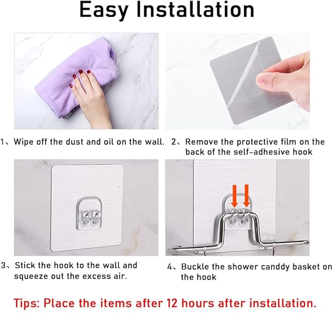Paket içeriği: 4 adet duş caddy yapışkan kanca, güçlü taşıma kapasitesi, 1 parça için 7 lb/3KG altında bir ağırlık taşıyabilir.