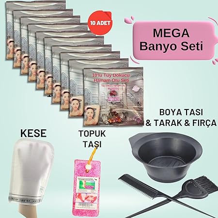 Paket İçeriği: 10 paket Hamam Otu + 1 Adet Boya Kabı + Tarak + Fırça + 1 adet Hamam Kesesi + 1 adet Topuk (Ponza) Taşı