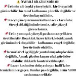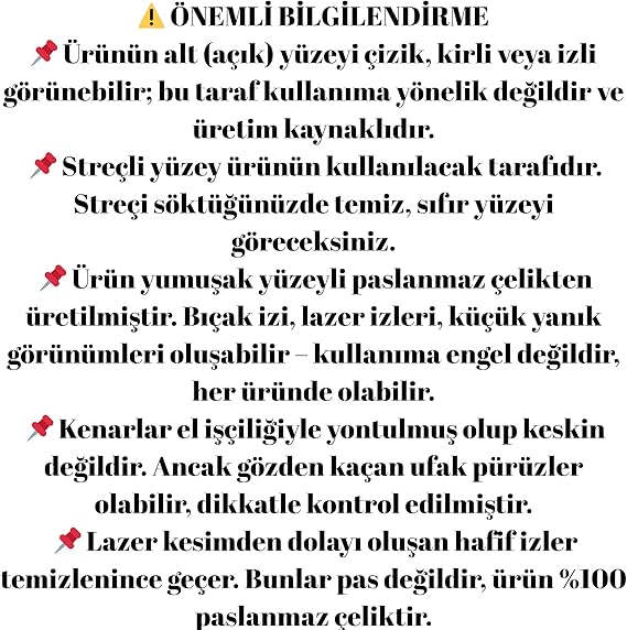 Doğru kullanım: Ürünü kullanırken, gri koruma filmi çıkarılmış üst yüzeyi kesim için tercih ediniz. Alt yüzey, silikon ayakların takılması için uygundur. Film olmayan alt yüzeyde üretimden kaynaklı lazer kesim izleri, ton farklılıkları ya da hafif izler olabilir. Bu izler pas değildir, kullanıma kesinlikle engel değildir, yalnızca makine işleminden kalan izlerdir.