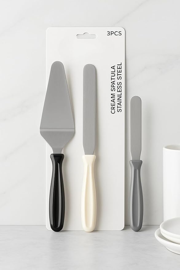 SET İÇERİĞİ: 3 parçalı pasta spatula seti – geniş servis spatulası, orta boy düz spatula ve küçük boy spatula içerir
