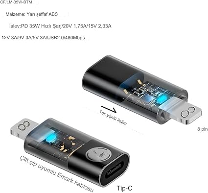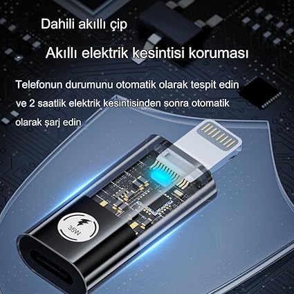 Type-C ile Lightning arasında bağlantı sağlar 35W güvenli ve hızlı güç aktarımı desteği (20V 1.75A/15V 2.33A 12V 3A/9V 3A/5V) OTG desteği ile harici hafıza kartı, klavye, fare gibi cihazları telefonunuza bağlayabilirsiniz. Kompakt ve şık tasarım Akıllı çip sayesinde 2 saatlik şarj kesintisinden sonra otomatik olarak şarj etmeye başlar.