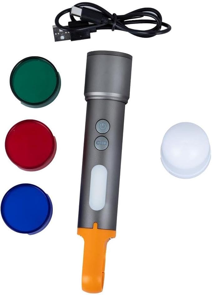 Kutu içeriğinde fener ile beraber başlıklar ve usb şarj kablosu bulunmaktadır. 4 Farklı başlık bulunmaktadır. (3 Adet renkli başlık: kırmızı renk, mavi renk, yeşil renk, 1 Adet beyaz renkli başlık) Type C şarj kablosu ile beraber USB den şarj edilebilir.