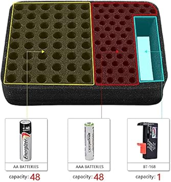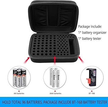 Daha fazla pil tipi için – 48 x AA, 48 x AAA, 1 x pil test cihazı, toplam 96 pil, Energizer, ACDelco, Panasonic, Duracell alkalin piller için idealdir.