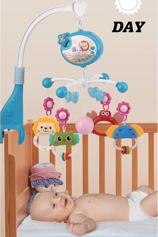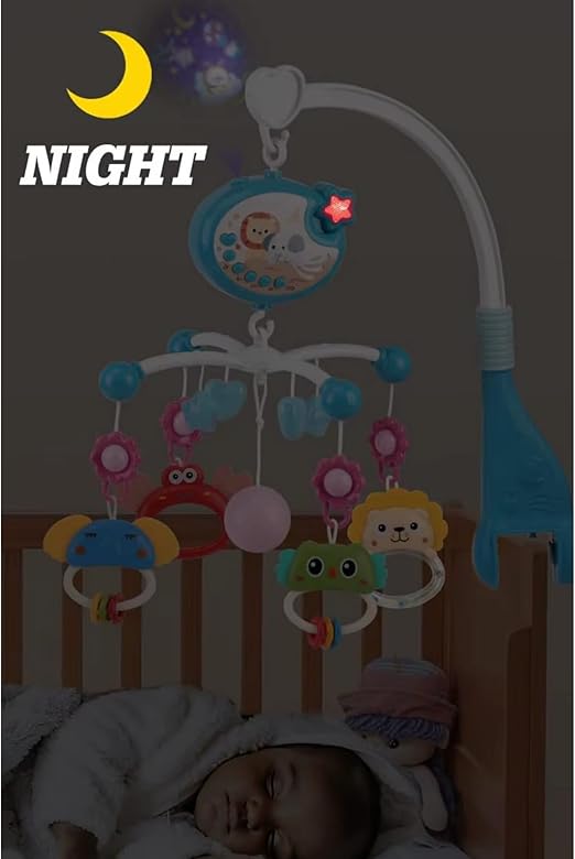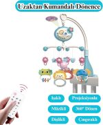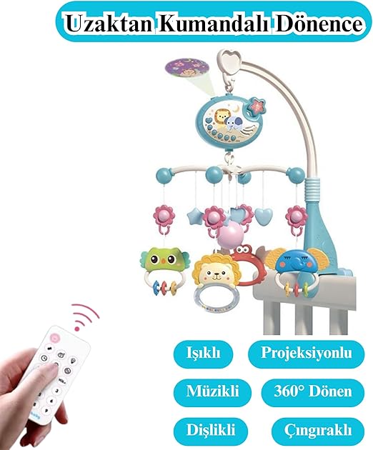 Pilli Işıklı Müzikli Projektörlü Kumandalı Sabitlemeli Dönence Çıngıraklı Dişlikli Bebek Yatıştırıcı Zaman Ayarlı (mavi)
