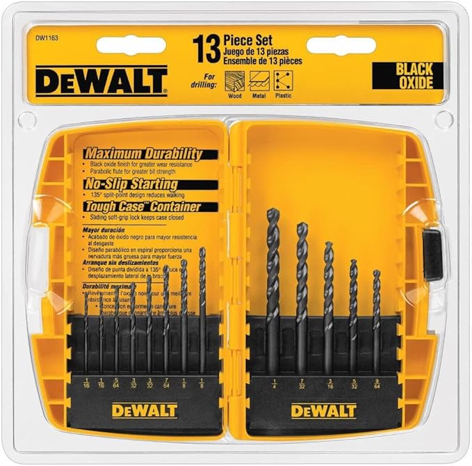 Bu set, 1/16 “- 1/4” uçlar arasında değişen 13 siyah oksit matkap ucu sunar ve sert bir kutu kabında saklanır