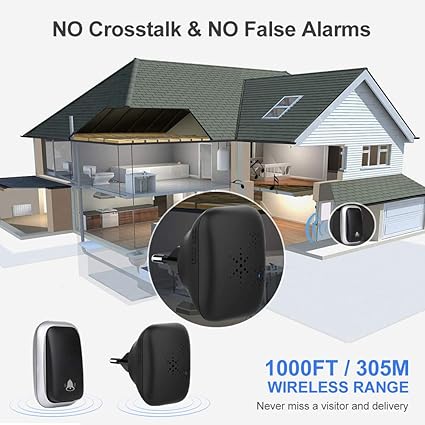 【Yan konuşma ve yanlış alarm yok】 Bu kablosuz kapı zili güçlü bir delme gücüne ve parazit önleyiciye sahiptir. Birden fazla engel için alan 152 m’ye (500 ft) kadar ve açık alanlarda 305 m’ye (1000 fit) kadardır. Evinizdeki diğer cihazları veya komşularınızı etkilemez ve birkaç oda uzakta olsanız veya başka bir katta olsanız bile hiçbir ziyaretçiyi kaçırmamanızı sağlar.