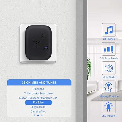 【38 zil sesi ve 4 ses seviyesi】Kapı zili için kablosuz stereo hoparlörümüz zengin ve net bir ses sağlar. Kişisel zevkinize göre 38 zil sesi ve 4 ses seviyesi (sessiz açma dahil) geniş bir seçenek sunar. İlk zil sesine (Dingdong) geri dönmek için ses seviyesi tuşuna basın. Hafıza fonksiyonu ile kablosuz zil elektrik kesintisinden sonra son ayarlarınızı hatırlar.