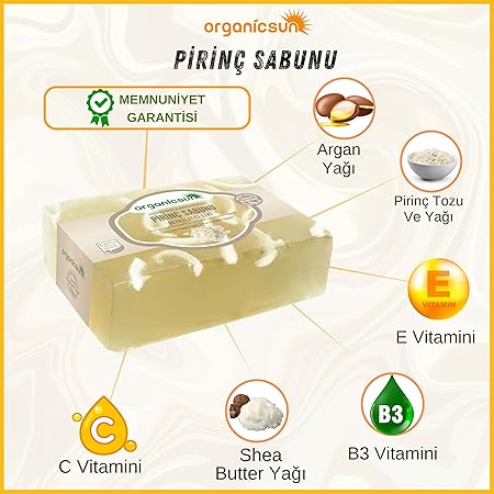 Doğal ve Sağlıklı İçerikler : Organicsun Pirinç Sabunu, paraben ve zararlı kimyasallar içermez . Doğal pirinç tozu, pirinç yağı, shea butter ve E vitamini ile zenginleştirilmiş formülü sayesinde cildiniz için en iyisini sunar. Cildinizi nemlendirir, besler ve korur.