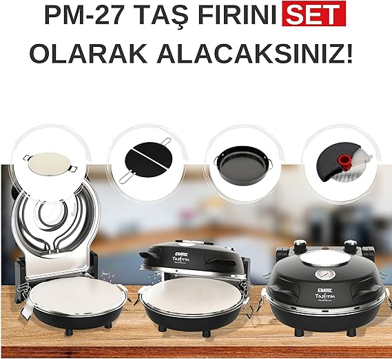 – Pizza fırını, SET-PM-27. 400°C’ye kadar sıcaklık, 5 pişirme kademesi, pizza 4 dakika hazır, aksesuarlar dahil: 32 cm ateşe dayanıklı taş plaka, XXL tava eklentisi, pizza küreği, pizza kesici.