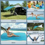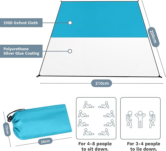 Plaj örtüsü, kum tutmaz, dış mekan örtüsü, ultra hafif, piknik örtüsü, su geçirmez, 210 x 200 cm, kum kamp örtüsü, su geçirmez ve 4 sabitleme, kum tutmaz, çadır altlığı (su mavisi)