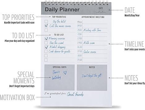 GÜNLÜK GÜNÜNÜZÜ PLANLAYIN: Bu günlük planlayıcı ile görevlerinizi, özel günlerinizi ve alışkanlıklarınızı hatırlayacak ve günlük işlerinizi verimli bir şekilde organize edebileceksiniz. Zaman çizelgesi ile gününüzün saatlerini planlayabilirsiniz. Ayrıca, yaşadığınız güzel olayların notlarını alarak anılarınızı unutulmaz kılın!