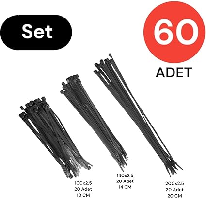 Plastik Kablo Bağı Cırt Kelepçe Set 100 mm – 150 mm – 250 mm X 2.5 mm Siyah (20 şer adet X 3) 60 Adet
