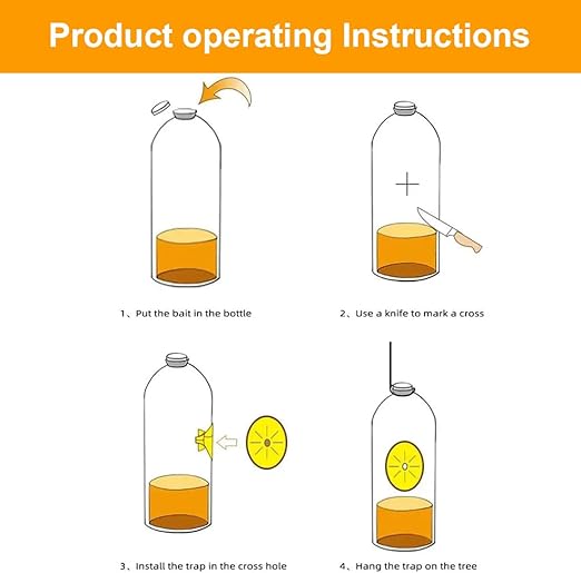 Kolay kullanım: Plastik su şişesinin kapağını çapraz şeklinde kesin ve eşek arısı tuzağını yerleştirin. Ardından plastik su şişesini biraz bal, şurup, meyve suyu, limonata veya şekerli su ile doldurun ve eşek arıları çekilir, tuzağa tırmanır ve tünelden şişeye düşer.