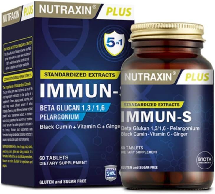 Nutraxin Immun-S; geliştirilmiş formulünde yer alan 1,3 – 1,6 Beta-Glukan ile birlikte çörek otu, afrika sardunyası ve zencefil bitkilerini bir arada içeren özel bir formüldür.