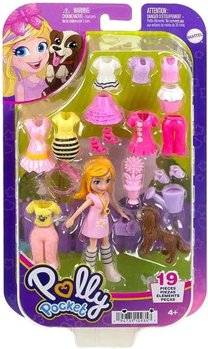 dahil bileşenler: 3 inç Polly Pocket bebek, 1 köpek yavrusu ve çiçek temalı 17 moda aksesuarı içerir
