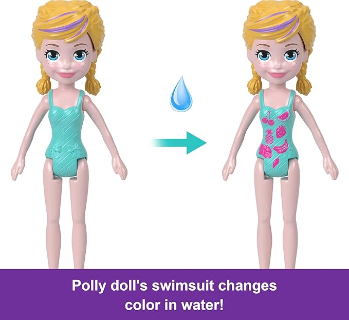 Çocuklar yağmur özelliğini etkinleştirmek ve dalmaya giderken Polly bebeğinin mayosunun rengini değiştirmek için üst havuzu suyla doldurabilir.