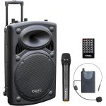 PORT15UHF-BT: USB okuyuculu, Bluetooth’lu, 1 adet elde tutulabilir UHF 863 MHz mikrofonlu, 1 adet UHF 865MHz headset mikrofonlu, 400W RMS ve maks. 800W güce sahip, pille çalışan taşınabilir hoparlör.