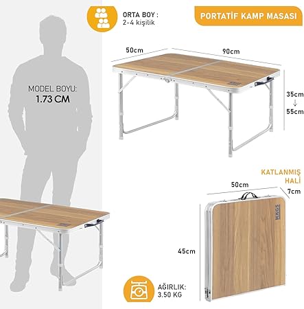 ✅ AYARLANABİLİR YÜKSEKLİK: Katlanır outdoor, kamp, piknik masasının yüksekliği 2 seviyede (35-55 cm) ayarlanabilir. Bu nedenle farklı yükseklikteki sandalyelerle kolaylıkla kombinlenebilir ve hem yetişkinler hem de çocuklar için uygundur. Günlük ihtiyaçlarınız tamamen karşılanabilir