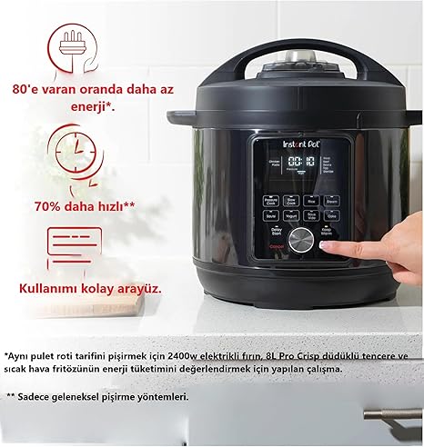 Zaman tasarrufu: Basınçlı pişirme sırasında geleneksel yöntemlere kıyasla pişirme süresini %70’e kadar azaltır. Beğendiğiniz şeylere daha fazla zaman ayırın, mutfağa daha az zaman ayır