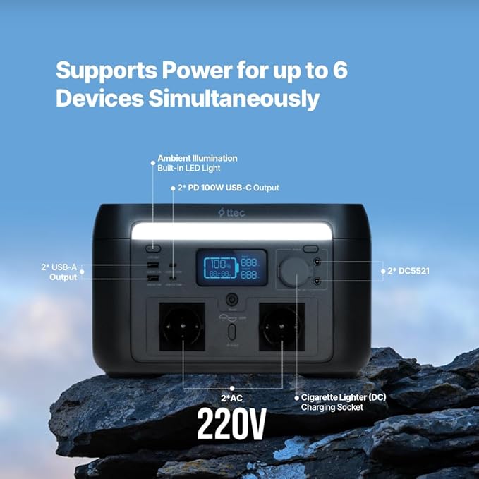 2 adet AC 220V, 1 adet çakmak şarj (DC), 2 adet DC 5521, 2 adet USB-A, 2 adet PD 100W USB-C çıkışları ile aynı anda 9 cihaza kadar güç desteği