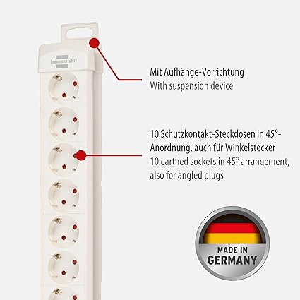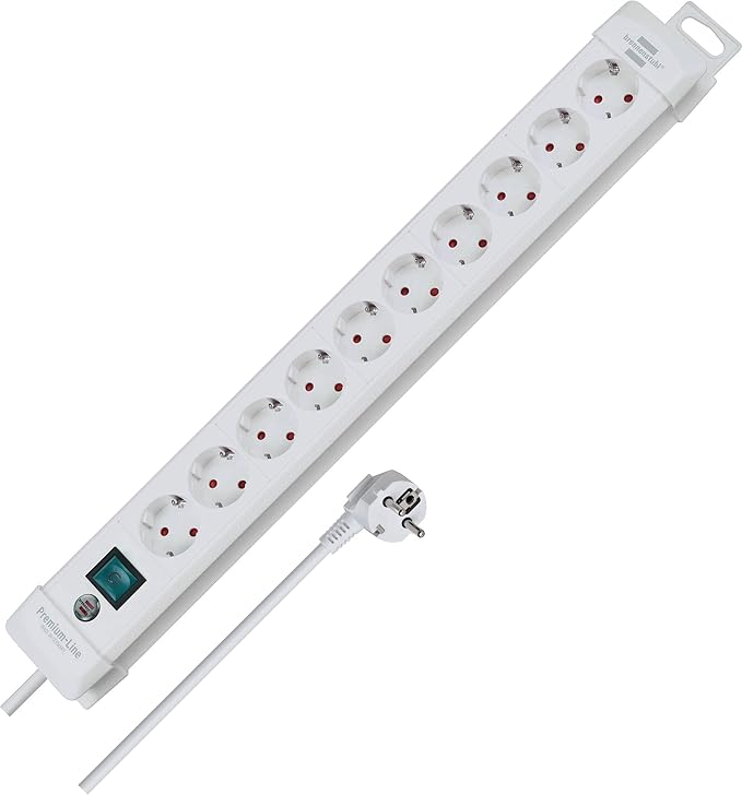 Premium-Line, 10’lu çoklu priz (anahtarlı ve 3 m kablolu priz – topraklı prizlerin 45° açısı, Alman Malı) beyaz